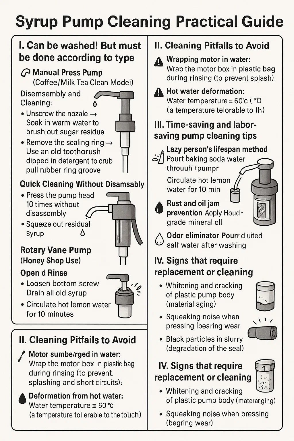 برای لکه های قندی سرسخت، از سشوار برای گرم کردن استفاده کنید ← نرم شده و به راحتی بشویید. برای حلقه های آب بندی چسبنده ← برای جلوگیری از چسبیدن نشاسته ذرت بپاشید. پمپ های یدکی را در روغن زیتون خالص نگهداری کنید.