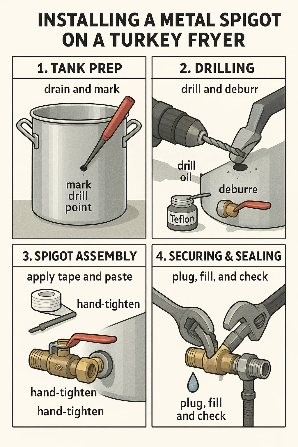 تست مهر و موم: spigot plug → مخزن پر از آب → برای گریه کردن در نخ ها را بررسی کنید