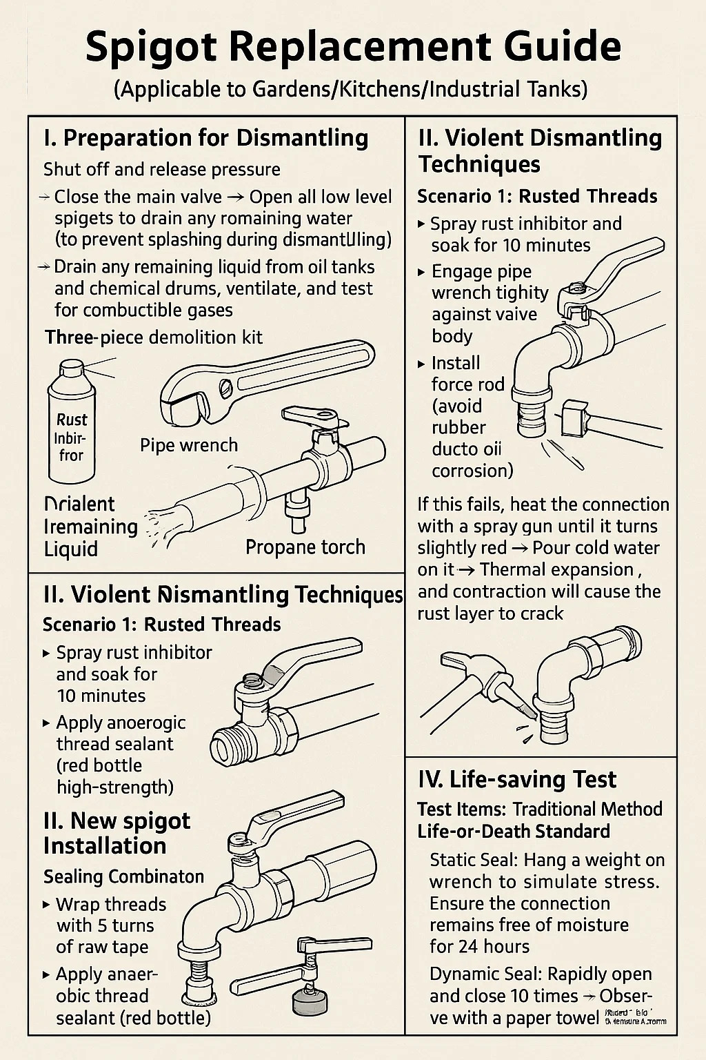 مهار کننده زنگ زدگی را اسپری کرده و به مدت 10 دقیقه خیس کنید → آچار لوله را محکم در مقابل بدنه دریچه درگیر کنید → میله نیرو را نصب کرده و به آرامی محکم کنید (نیروی ناگهانی ممکن است انتهای لوله را بشکند)