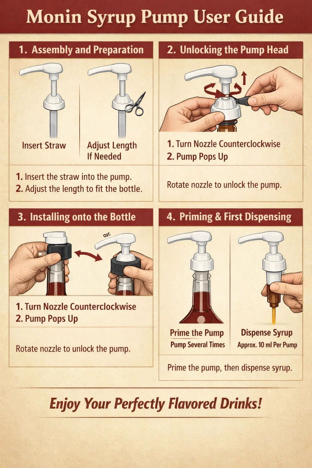 برای پمپ شربت مونین که یک ابزار کلاسیک میله است، استفاده صحیح از آن باعث می شود نوشیدنی شما روان تر شود و کیفیت شربت بهتر حفظ شود.