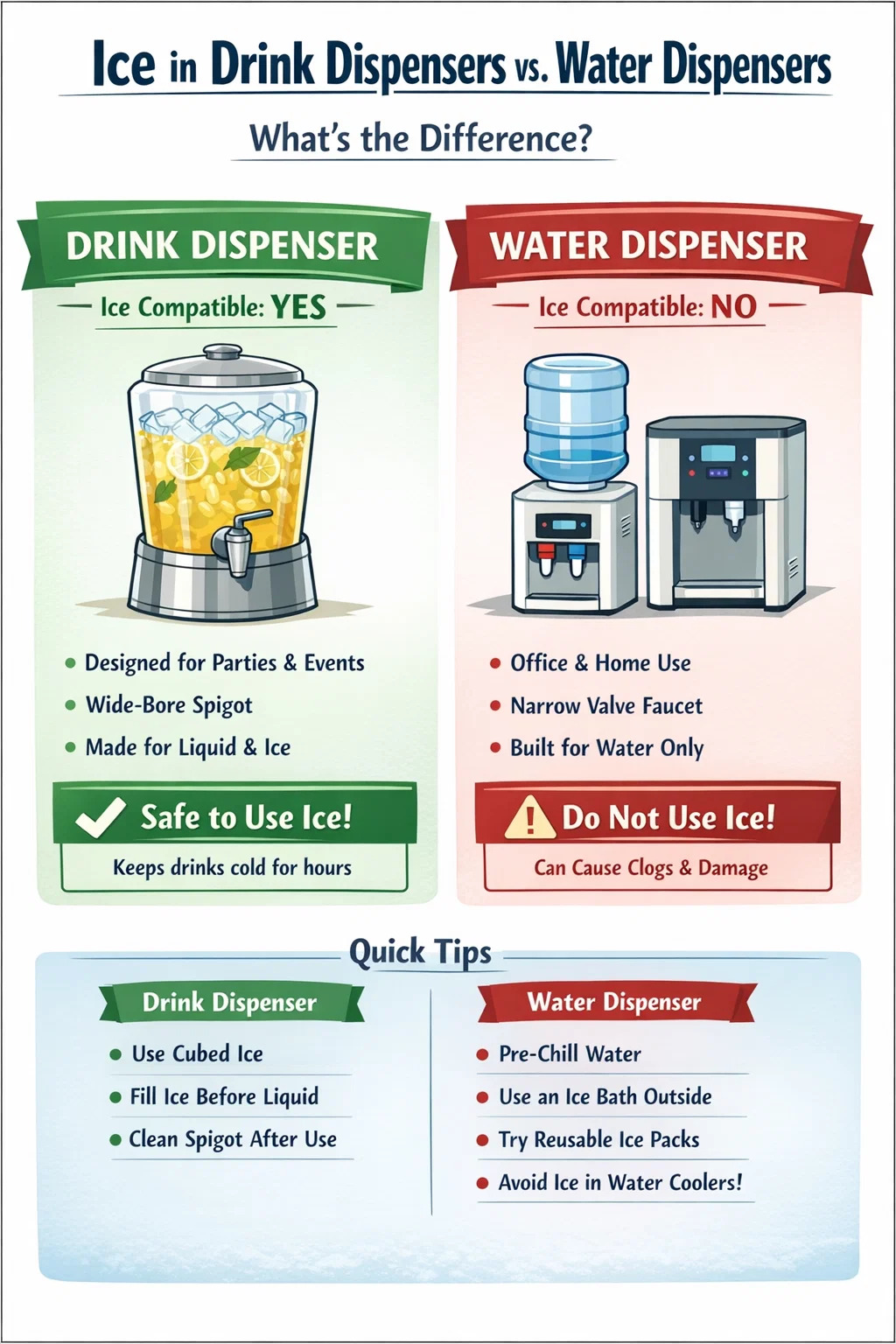 | آیا یخ میتواند در دستگاه نوشیدنی برای مهمانی/رویداد برود؟ | بله, if it has a wide-bore spigot and food-grade materials |
