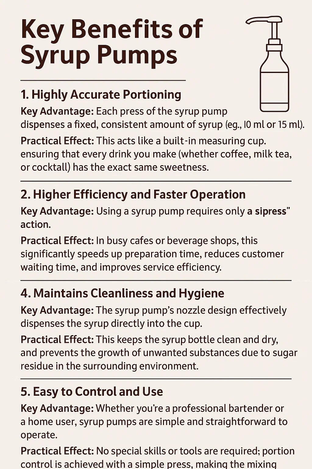 مزیت کلیدی: استفاده از پمپ شربت فقط به یک اقدام **"فشردن"** نیاز دارد، مراحل متعددی مانند باز کردن درب بطری، ریختن، پیدا کردن یک فنجان اندازه گیری و سپس بستن درب را حذف می کند.