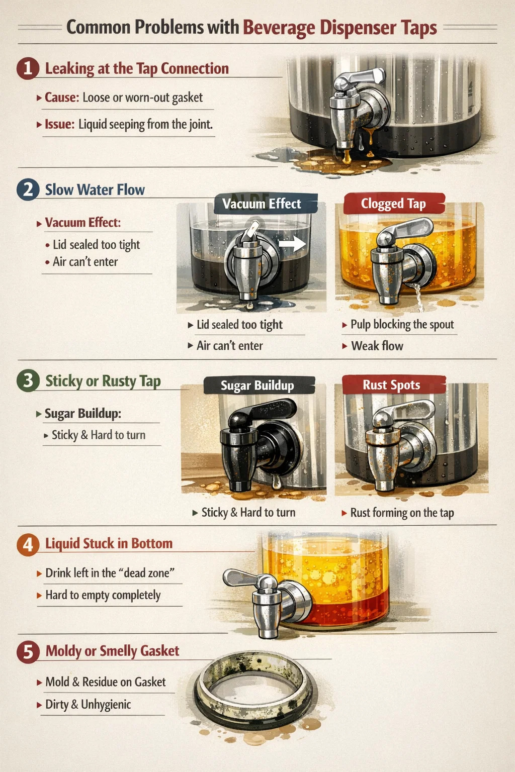 هنگام استفاده از پخش کننده های نوشیدنی، اگرچه از نظر طراحی ساده به نظر می رسند، می توانید با مشکلات جزئی خسته کننده مواجه شوید. این امر به ویژه برای مؤلفه اصلی - the شیر نوشابه فلزی - که اگر به درستی نگهداری نشود بیشتر مستعد مشکلات است.