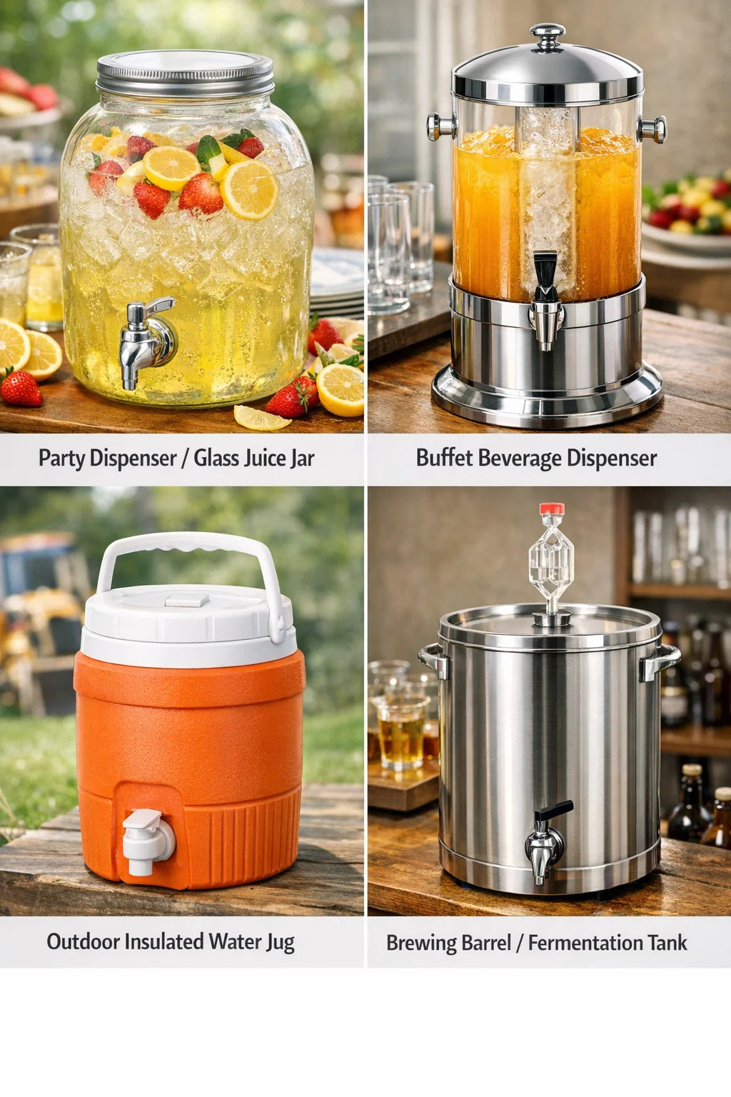 در زندگی روزمره ما، این ظروف با یک شیر کوچک که افراد برای تهیه نوشیدنی دور آن جمع می شوند، بسته به ظاهر و کاربردشان چندین نام متفاوت دارند. اگر به صورت آنلاین جستجو میکنید یا در فروشگاهی میپرسید، استفاده از نامهای زیر مطمئناً نتیجه درستی را به دست میآورد: