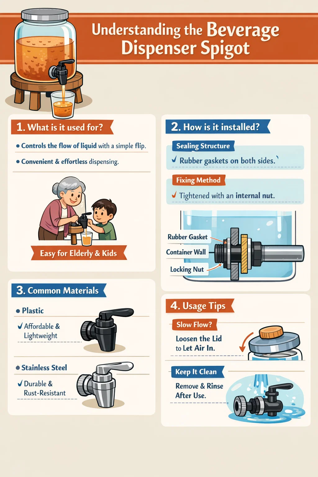 اسپیگوت توزیع کننده نوشیدنی شیر یا شیر کوچکی است که در پایین ظرف نوشیدنی یا مخزن آب نصب می شود. این قلب کل ظرف است. بدون آن، برای ریختن مایع باید ظرف سنگین را بلند کنید.