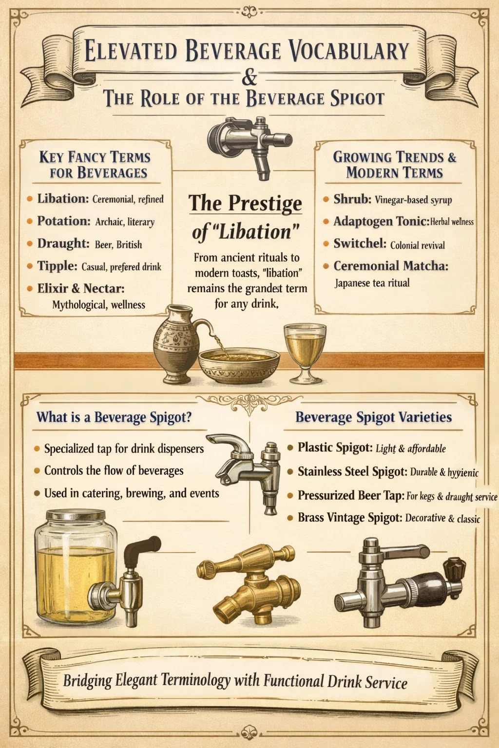 فراتر از مترادف های تک کلمه ای، واژگان پیرامون نوشیدنی ها - از جمله اصطلاحات سخت افزاری مانند دمنوش نوشیدنی - لایهای از زبان تصفیه شده خود را دارد. برای مثال، اسپیگوت نوشیدنی، نام رسمی مکانیزم شیر یا دریچه ای است که برای پخش مایع از ظرف، خنک کننده یا بشکه استفاده می شود و به واسطه ارتباط آن با سرویس نوشیدنی ویژه، خود را از یک شیر آب معمولی متمایز می کند. درک این اصطلاحات به شما امکان می دهد هم زبان نوشیدنی ها و هم فرهنگ اطراف آنها را کنترل کنید.